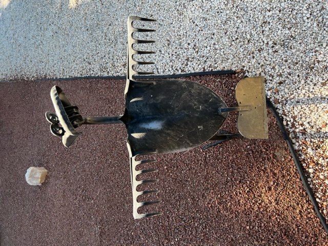 (Right) An old rake, shovel, hoe that has been repurposed and creatively made into a bird.