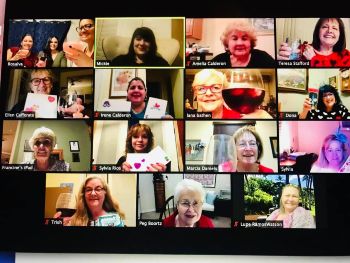 Members meet virtually to enjoy time together and to make Valentine's Day cards for staff and residents of INRC.