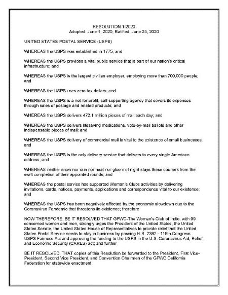 June 2020:  The members of GFWC Woman's Club of Indio overwhelmingly voted in June to adopt a Resolution supporting the United States Postal Service ("USPS").  The United States Post Office was established in 1775 and is Constitutionally required to serve all Americans, regardless of geography.